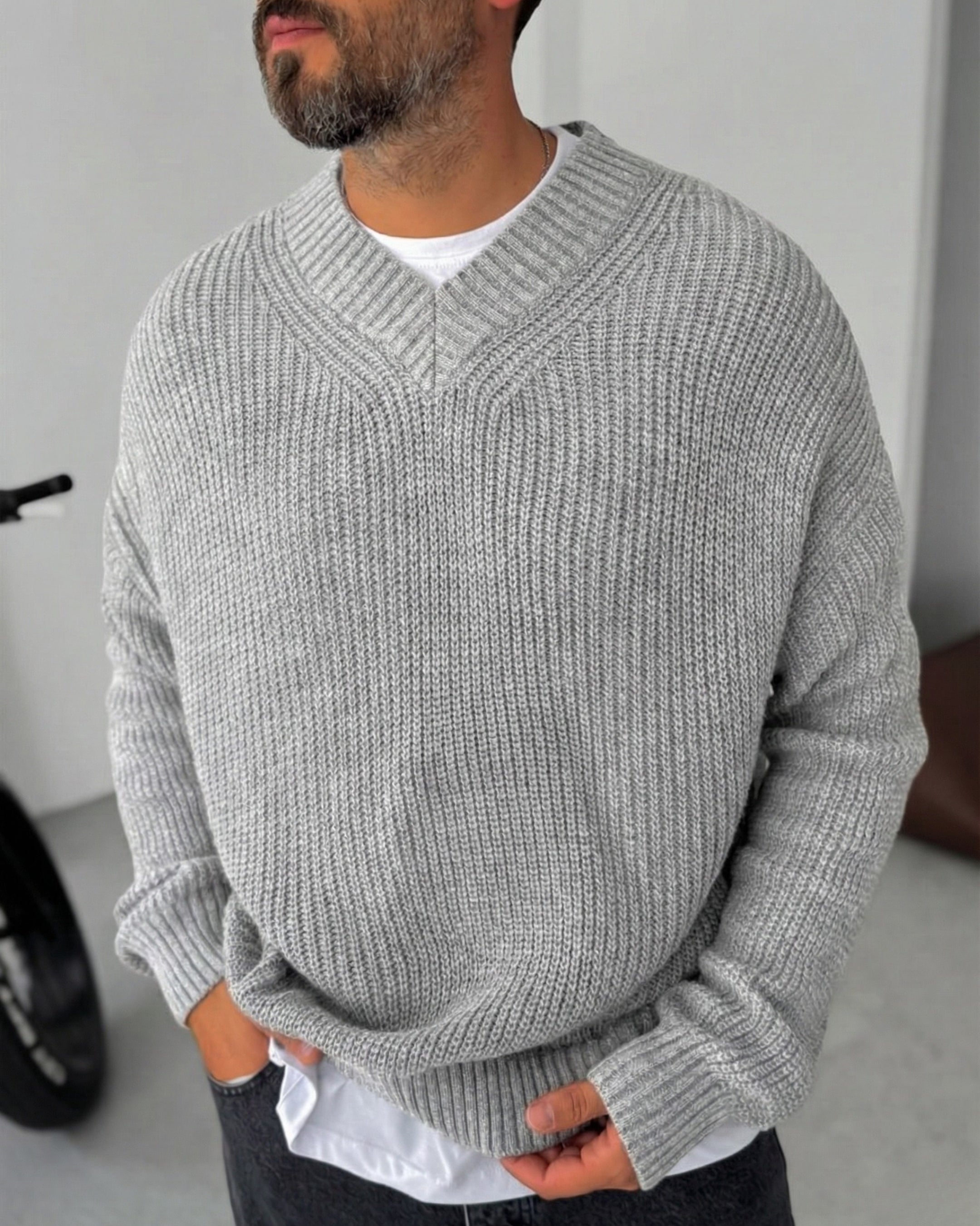 Premium Knitted V-Neck Sweater - Gray