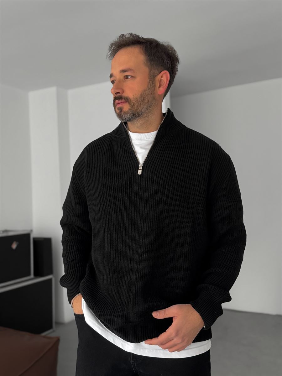Premium Ribbed Quarter-Zip Knit Sweater - Black